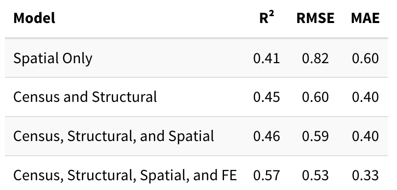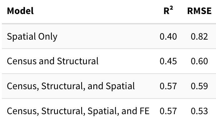 Model 4: Structural, Census, Spatial, and Fixed Effect Data