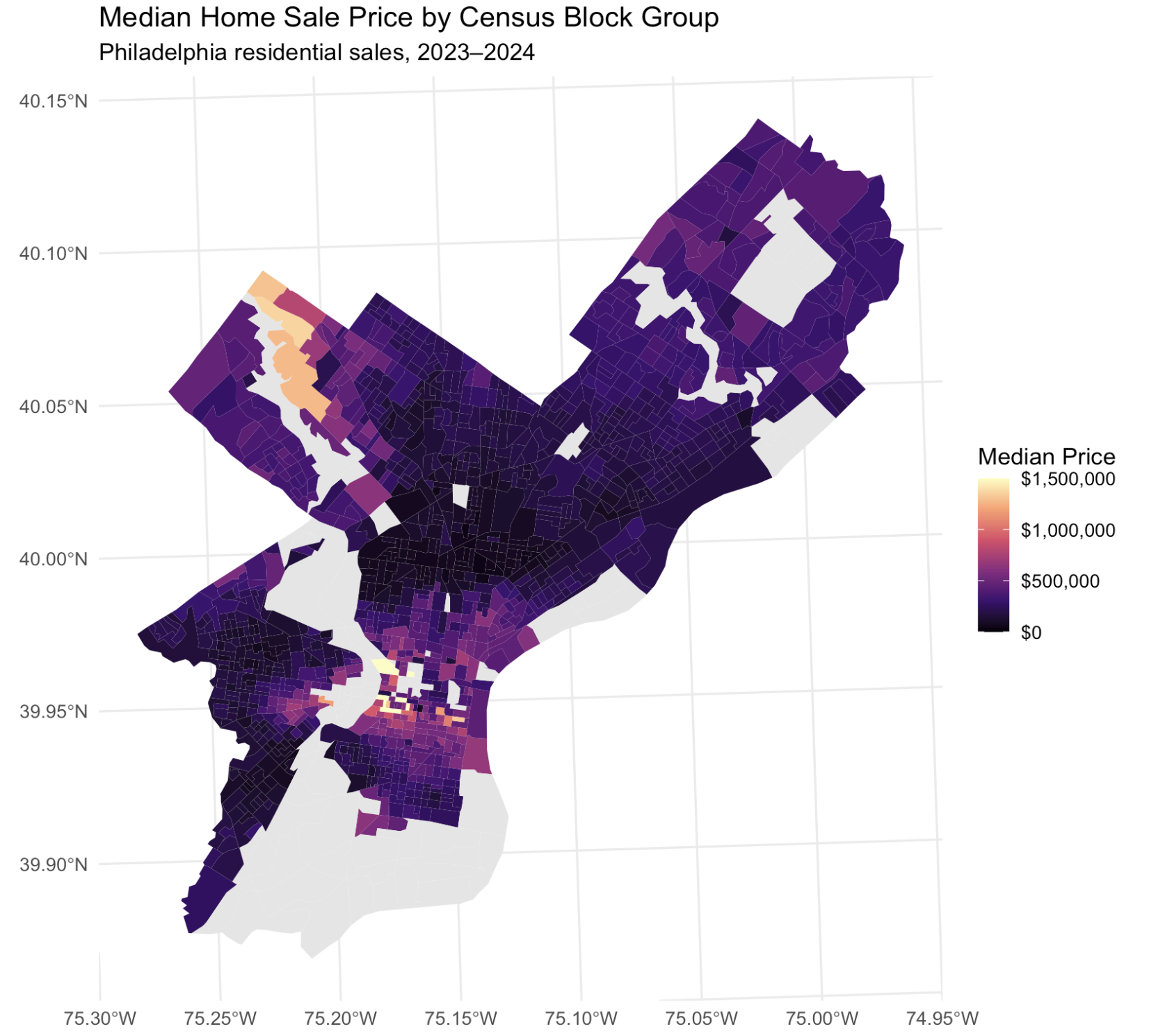 Center City and Northwest Philly have many of the highest prices, with some areas having median sale values in the $ millions